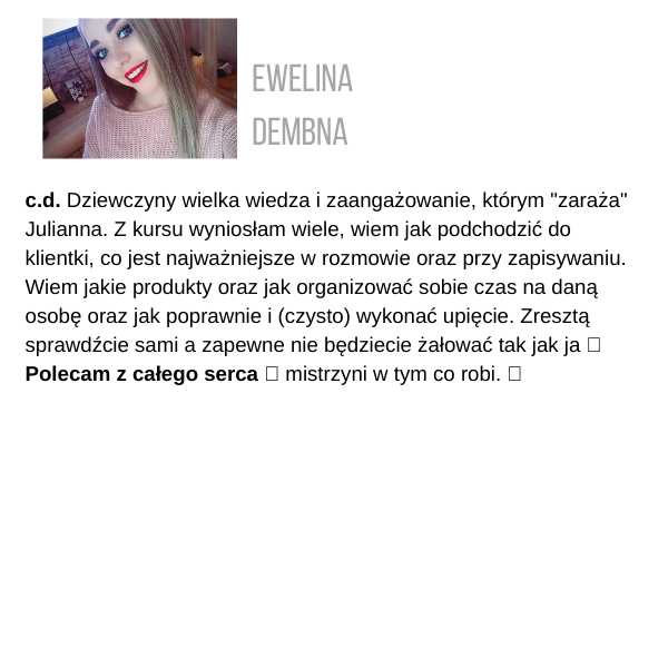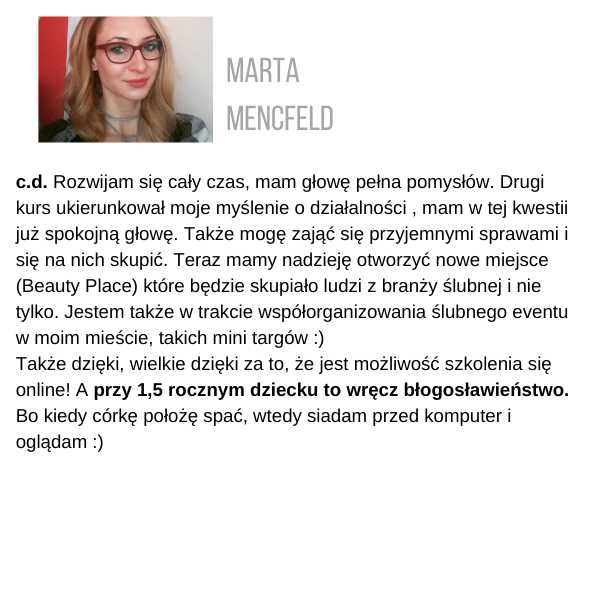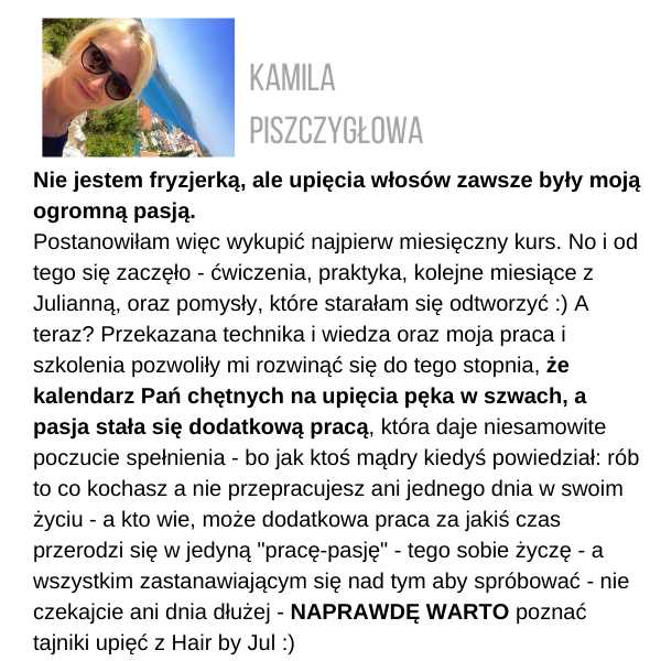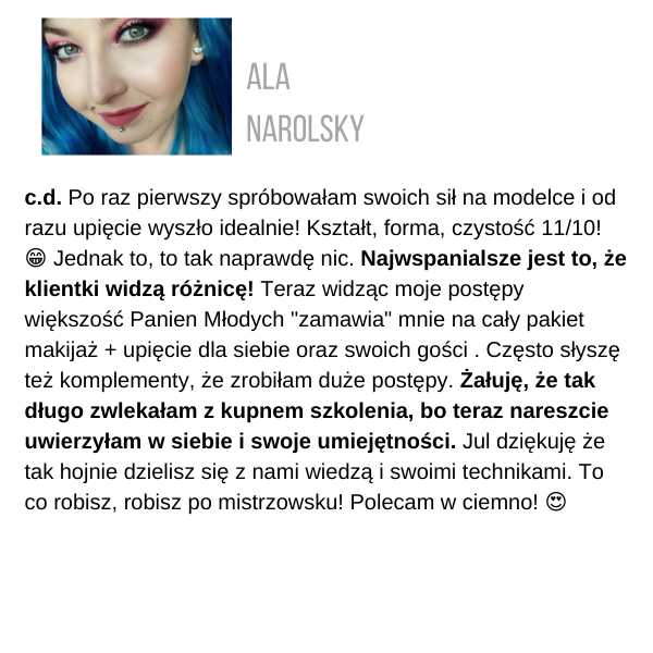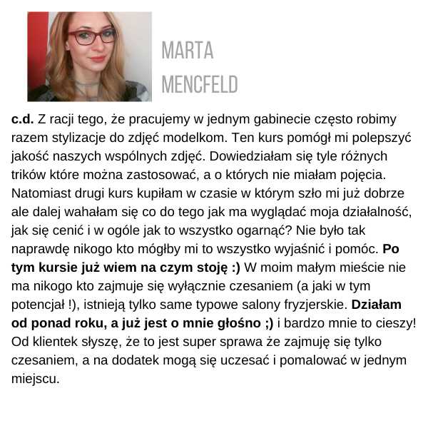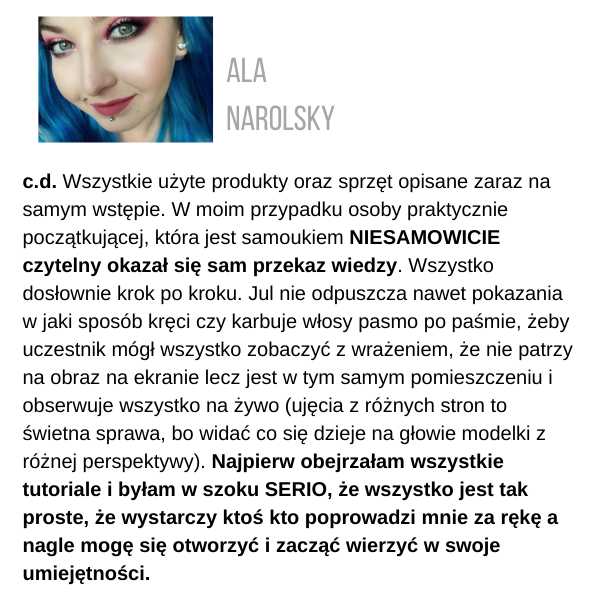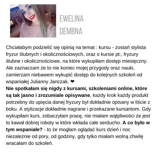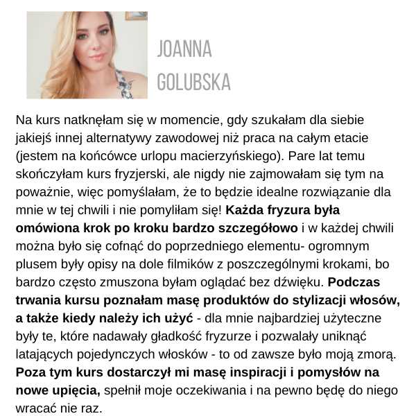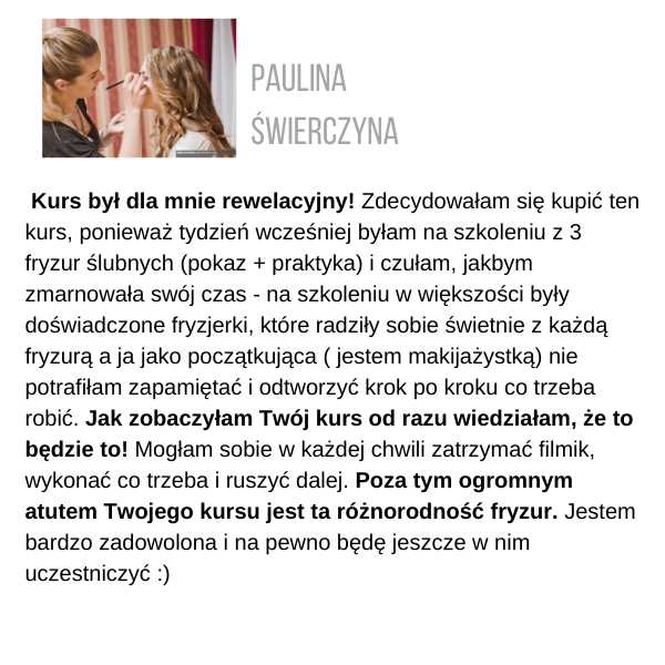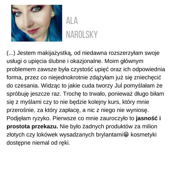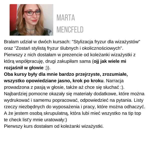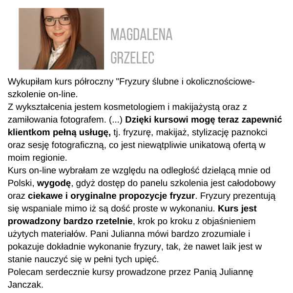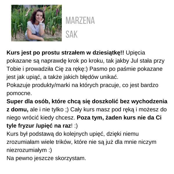 Żeby otrzymać certyfikat, musisz wysłać zdjęcia przynajmniej 3 fryzur ze szkolenia, które zrobiłaś samodzielnie, na adres: kontakt@juliannajanczak.pl, w tytule maila wpisując: Certyfikat i nazwę szkolenia. W przeciągu tygodnia w odpowiedzi otrzymasz ode mnie certyfikat, który będziesz mogła wydrukować.